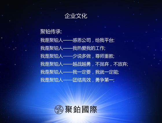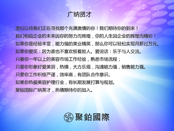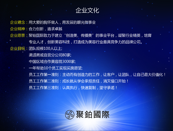 企业愿景:聚铂国际致力于建立“创造美、传播美”的事业平台,凝聚行业精英,培育专业人才,创新美容科技,打造成为美容行业最具竞争力的品牌公司。
