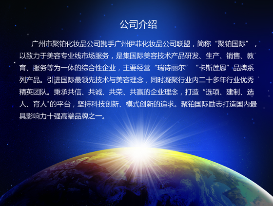 广州市聚铂化妆品公司携手广州伊菲化妆品公司联盟,简称“聚铂国际”,以致力于美容专业线市场服务,是集国际美容技术产品研发、生产、销售、教育、服务等为一体的综合性企业,主要经营“瑞诗丽尔”“卡斯莲恩”"铂美斯“品牌系列产品。引进国际最领先技术与美容理念,同时凝聚行业内二十多年行业优秀精英团队,是一群具有二十多年行业成功经验,有志向,有梦想,有才华,懂分享。我们乐于创新,将最新科技与传统美容相结合,将最好的产品与服务提供给我们的合作伙伴,不断为我们的客户最大限度的创造价值、为消费者提供高性价比的最前沿科技美容项目,为团队成员的努力付出成果给予最大化的肯定与回报。我们立志成为化妆品行业最具幸福感的企业之一,让聚铂体系内成员深感荣誉感和责任感,让聚铂国际企业与所属品牌赢得行业的认可与尊重,不断凝聚更多人的智慧,更多年的永续传承发展。聚铂国际励志打造国内最具影响力十强高端品牌之一。
