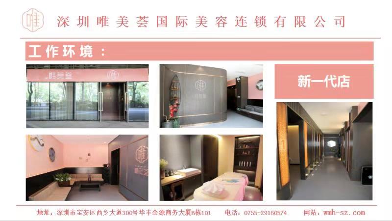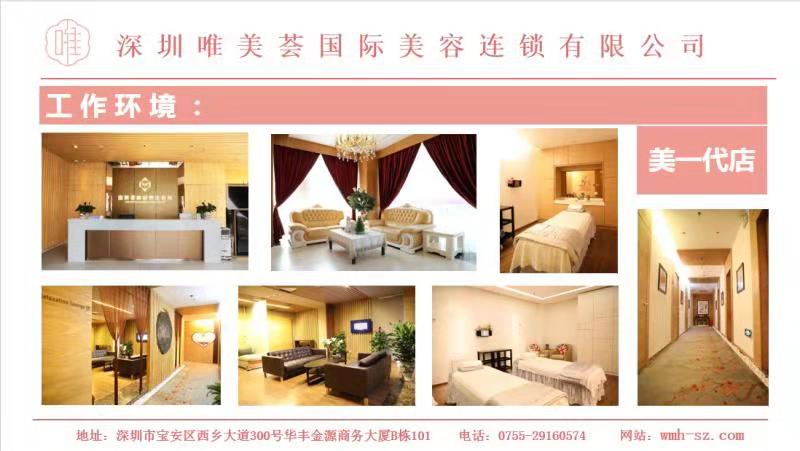 深圳市唯美荟国际美容连锁有限公司成立于2013年,所管理的直营连锁遍布南山、蛇口、宝安、沙井,单店面积150-1000平方米。